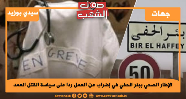 ينفذ الإطار الطبي بالدائرة الصحية ببئر الحفي بداية من اليوم الاثنين 16 نوفمبر 2020 إضرابا عن العمل وذلك كرد على سياسة التسويف والمماطلة وتهميش وتفقير القطاع الممنهجة.