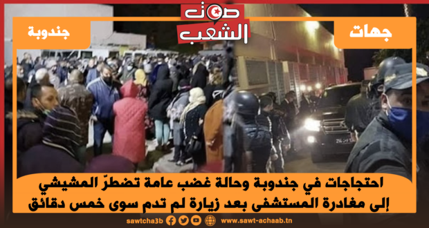 نفّذ اهالي جندوبة وأبناء قطاع الصحة تجمعا احتجاجيا كبيرا بالمستتشفى الجهوي بجندوبة ليلة البارحة الجمعة 4 ديسمبر 2020 رفعت خلاله مجموعة من الشعارات ضد منظومة الحكم الفاسدة والتي اضطرت “رئیس الحکومة هشام المشيشي” إلى المغادرة بعد زيارة لم تدم سوى خمس دقائق.