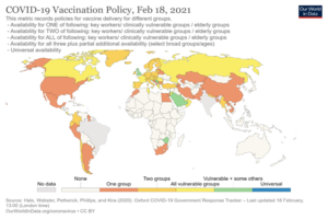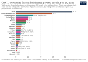A ce jour (26 Février) plus de 88 pays ont commencé la vaccination. Les pays avec la plus grande couverture vaccinale sont l’entité sioniste avec (91.55 doses administrées /100 personnes) , les Emirats Arabes Unis (59.11 doses administrées /100 personnes), le Royaume Unis (28.57 doses administrées /100 personnes), les Etats Unis (20.41 doses administrées /100 personnes).L’immunité collective serait atteinte à partir d’environ 120 doses pour 100 habitants. La France n’a atteint qu’un taux de (.16 doses administrées /100 personnes. Cela est principalement dû à des problèmes de production et de livraison des trois types de vaccins approuvés jusqu’à présent pour une utilisation dans l’Union Européenne (3).