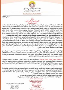 وفي ذات البيان طالبت النقابة الدولة التونسية بفتح ملفات العدوان الصهيوني على الأراضي التونسية من خلال عملياته العسكرية الجبانة وقتل مقيمين ومواطنين على التراب التونسي. إضافة إلى وجوب تسخير كل الجهود الوطنية من أجل رفع قضايا بالعدو الصهيوني حول مجازره.