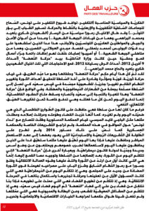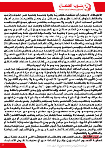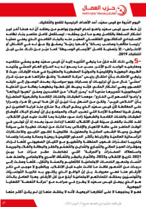 إنّ حزبنا إذ يُدين اليوم الاعتقالات التي تشمل السّياسيّين والنّقابيّين والإعلاميّين والمدوّنين والمحتجّين كما يُدين محاكمات تصفية الحسابات وغلق المقرّات الحزبيّة ومنع الاجتماعات بقرار إداري بمقتضى قانون الطوارئ الفاشستي الموروث عن الدّكتاتوريّة ويدعو إلى التّعبئة ضدّ ذلك من أجل وضع حدّ له ومنع استمراره واتّساعه قبل أن يأتي على الأخضر واليابس.