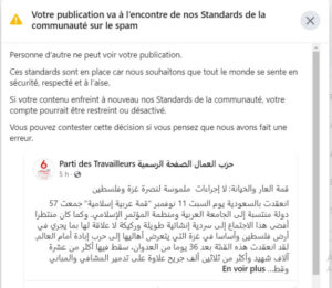 أقدمت إدارة فايسبوك ليلة البارحة على حذف بيان حزب العمال “قمّة العار والخيانة: لا إجراءات ملموسة لنصرة غزّة وفلسطين”، حسب ما ذكرت صفحة جريدة صوت الشعب.