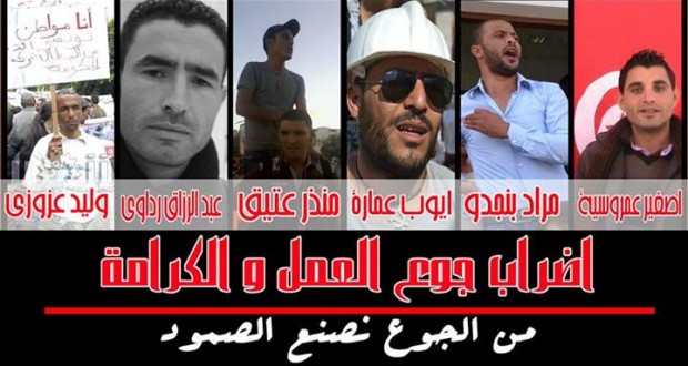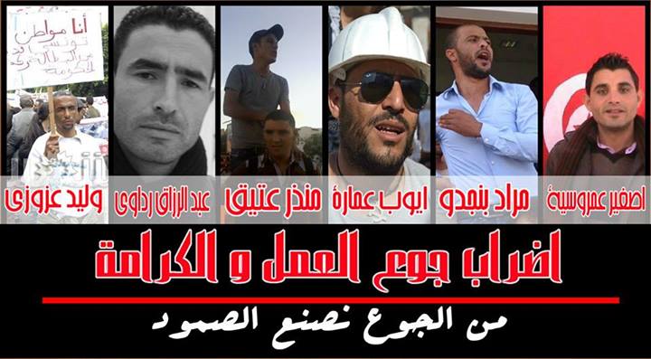 يُذكر أن أيوب عمارة ومراد بن جدّو والصغير عمروسية ووليد العزوزي ومنذر عتيق وعبد الرزاق الرداوي، المضربون عن الطعام منذ 38 يوما يطالبون بحقّهم في الانتداب في الوظيفة العمومية باعتبارهم من المتمتعين بالعفو التشريعي العام.