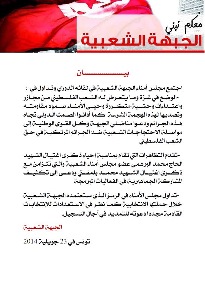 أدان مجلس أمناء الجبهة الشعبية المنعقد أمس الأربعاء 23 جويلية 2014، في بيان له، الصمت الدولي تجاه الجرائم المرتكبة في حق الشعب الفلسطيني بقطاع غزة، داعيا مناضلي الجبهة وكل القوى الوطنية إلى مواصلة الاحتجاجات الشعبية ضدّ هذه المجازر والاعتداءات الوحشية المتكرّرة.وقدّم بيان مجلس الأمناء التظاهرات التي تقام بمناسبة إحياء ذكرى اغتيال الشهيد الحاج محمد البرهمي عضو مجلس أمناء الشعبية والتي تتزامن مع ذكرى اغتيال الشهيد محمد بلمفتي ودعا إلى تكثيف المشاركة الجماهيرية في الفعاليات المبرمجة.