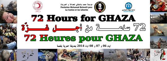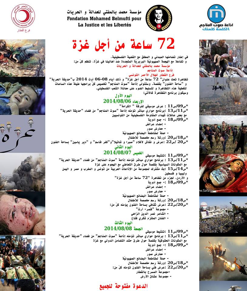 في إطار تضامنها المبدئي والمطلق مع القضية الفلسطينية وتفاعلا مع الهجمة الصهيونية البربرية المتجدّدة ضد أهالينا في غزّة، تنظم مؤسسة محمد بالمفتي للعدالة والحريّات، وإذاعة صوت المناجم، والهلال الأحمر التونسي فرع القطار، تظاهرة تحت عنوان “72 ساعة من أجل غزّة” وذلك أيام 6 و7 و8 أوت 2014 بحديقة الحرية وساحة الفنون بقفصة.