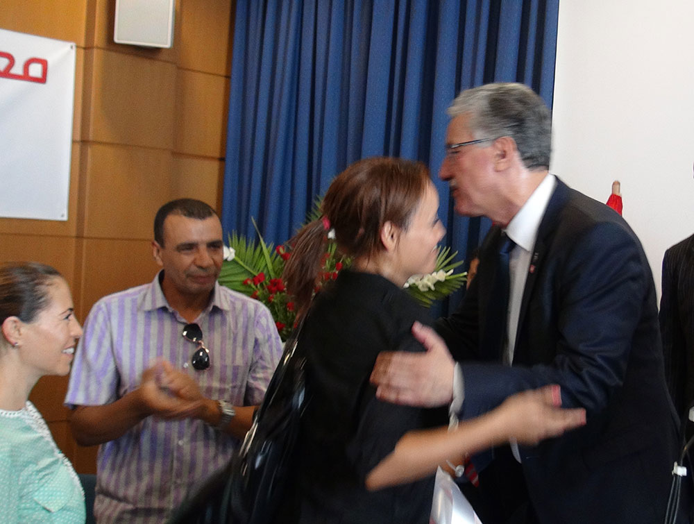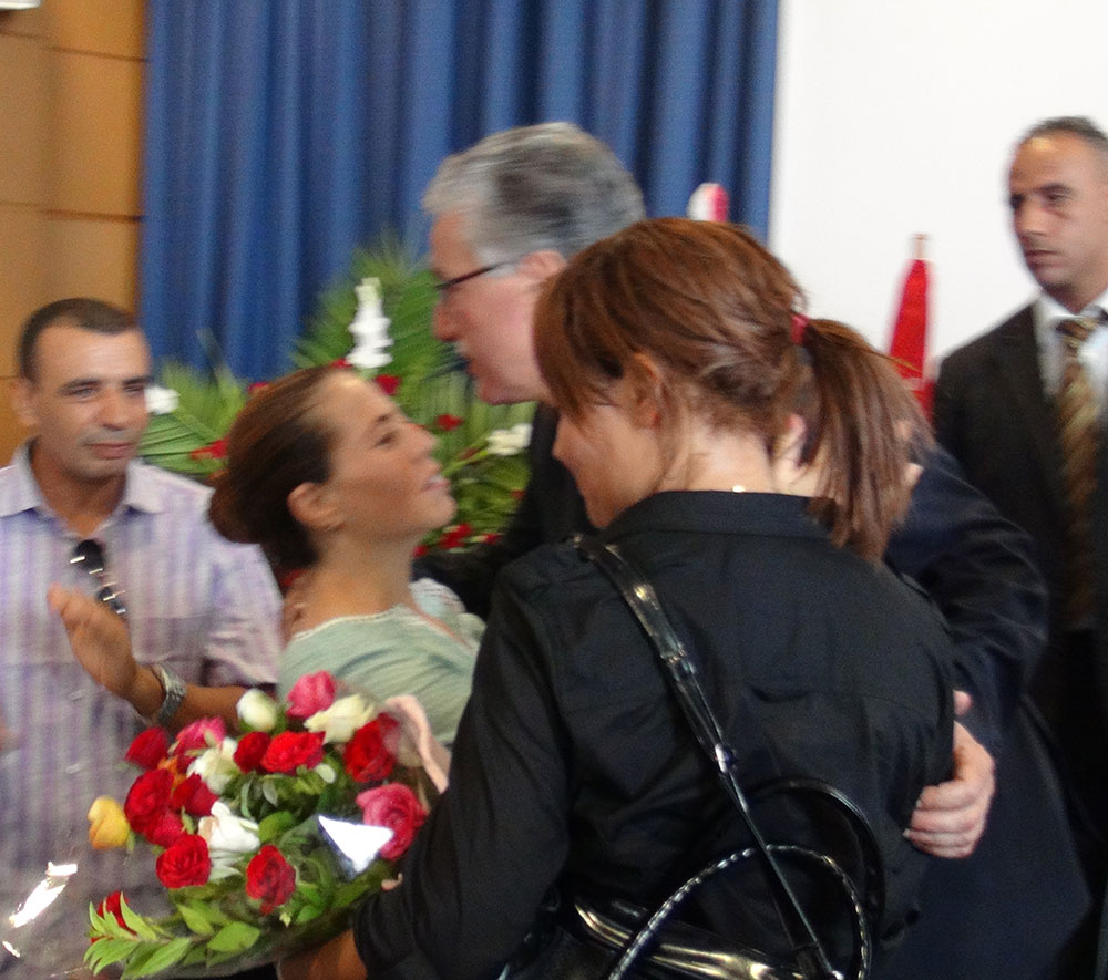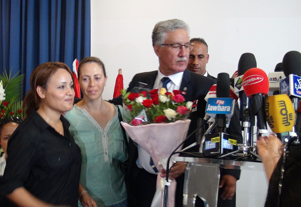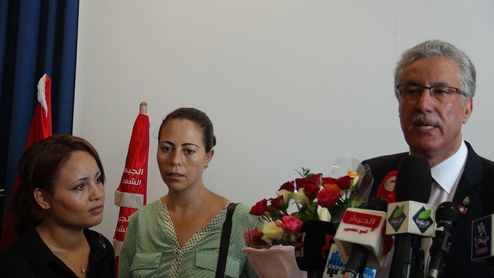 حضرت في الندوة الصحفية المنعقدة اليوم الخميس 18 سبتمبر 2014 للإعلان عن ترشّح الناطق الرّسمي بإسم الجبهة الشعبية حمّة الهمّامي للانتخابات الرئاسية، ممثلتان لعاملات شركة تجهيز الطيران “لاتيلاك” بالمغيرة من ولاية بن عروس، لتكريم حمّة الهمّامي وتقديم شكرهن للجبهة الشعبية لمساندتها لهن في كل تحرّكاتهن الاحتجاجية.