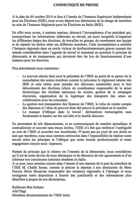 قدّم أعضاء الهيئة الفرعية المستقلّة للانتخابات بإيطاليا يوم السبت 4 أكتوبر 2014، استقالتهم من العمل صلب الهيئة، مرجعين سبب استقالتهم، إلى لا مبالاة الهيئة العليا المستقلة للانتخابات حسب تعبيرهم بالمشاكل والصعوبات التي يواجهونها بالهيئة الفرعية للانتخابات بإيطاليا.