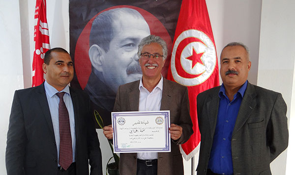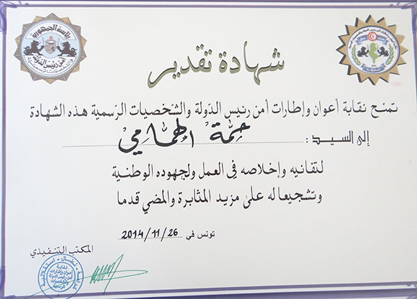 منحت نقابة أعوان وإطارات أمن رئيس الدولة والشخصيات الرّسمية اليوم الجمعة 28 نوفمبر 2014، شهادة تقدير للنّاطق الرّسمي بإسم الجبهة الشعبية حمّة الهمّامي، وذلك تقديرا منها لتفانيه وإخلاصه في العمل ولجهوده المبذولة من أجل خدمة الوطن والشعب، وتشجيعا له على مزيد المثابرة والمواصلة في النضال من أجل تحقيق الأهداف المرجوّة للبلاد.