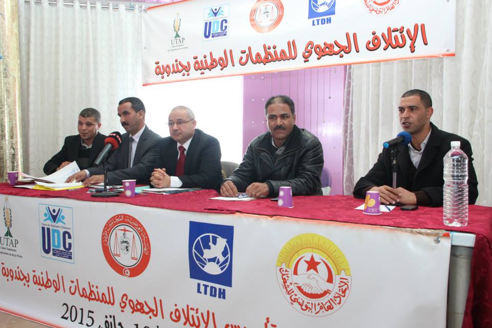 بدعوة من فروع المنظّمات الوطنيّة بجهة جندوبة، انعقد يوم السبت 10 جانفي 2015 بفضاء قصر الشّرق (الشرفة) اجتماعا عامّا بحضور عديد الوجوه النقابيّة والحقوقيّة والسياسيّة والشبابيّة لإعلان تأسيس “الإتلاف الجهوي للمنظمات الوطنية بجندوبة”، وهو ائتلاف يضمّ فروع كلّ من الاتحاد الجهوي للشغل بجندوبة، الرابطة التونسية للدفاع عن حقوق الإنسان – فرع جندوبة، الهيئة الوطنية للمحامين – الفرع الجهوي بالكاف (الكاف- جندوبة- سليانة)، اتحاد أصحاب الشهادات المعطلين عن العمل- المكتب الجهوي بجندوبة و الاتحاد الجهوي للفلاحة و الصيد البحري بجندوبة.