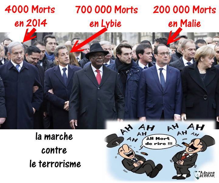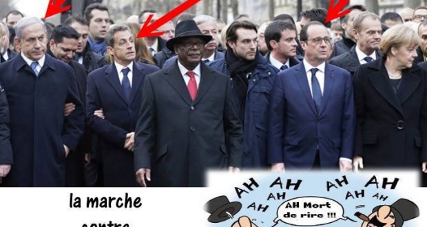 طرافة الصّورة أنّها تقدّم بعض رؤساء الدّول والحكومات على أساس أنّهم “دعاة” ديمقراطيّة وحماتها، وينبذون العنف والتطرّف، في حين أنّ سجلاّتهم حافلة بجرائم الحرب والقتل في حقّ شعوب أخرى. ولعلّ المثال الحيّ هو بنيامين نتايناهو، رئيس الحكومة الصهيونيّة، المسؤول عن عمليّات إبادة في حقّ الفلسطينيّين… فهل تحوّلت التنديدات بالإرهاب إلى مناسبة لتبييض الإرهاب؟