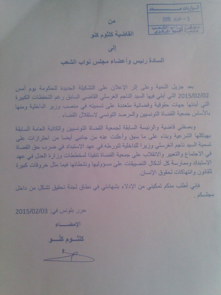 توجّهت القاضية كلثوم كنّو أمس الثلاثاء 3 فيفري 2015، إلى رئيس وأعضاء مجلس الشعب بطلب للإدلاء بشهادتها في نطاق لجنة تحقيق تُشكّل من داخل المجلس، وذلك بخصوص تسمية القاضي السّابق الناجم الغرسلي في منصب وزير الداخلية.