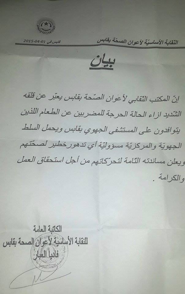 أصدر المكتب النقابي الأعوان الصحة بقابس بيانا عبّر فيه “عن قلقه الشديد ازاء الحالة الحرجة للمضربين عن الطعام اللذين يتوافدون على المستشفى الجهوي بقابس ويحمل السلط الجهوية والمركزية مسؤولية أي تدهور خطير لصحتهم ويعلن مساندته التامة لتحركاتهم من أجل إستحقاق العمل والكرامة”وفق ما جاء في نصّ البيان.