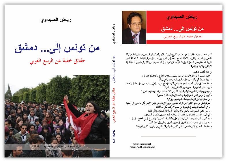 صدر لرياض الصيداوي مدير المركز العربي للدراسات السياسية والاجتماعية في جنيف كتاب جديد عنوانه “من تونس إلى … دمشق: حقائق خفية عن الربيع العربي”. ويباع الآن في المكتبات كما وقع عرضه في معرض تونس للكتاب. ومن المنتظر أن يطبع أيضا في بيروت وفي القاهرة. الكتاب جاء في 248 صفحة من القطع المتوسط ونقرأ فيه للمؤلف: