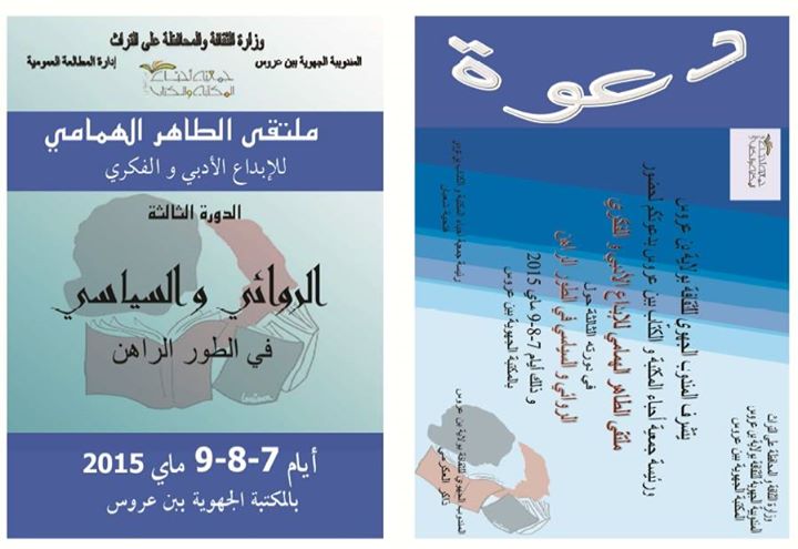 تنظم جمعية “احباء المكتبة والكتاب ببن عروس” بالتعاون مع “مندوبية الثقافة بالجهة” للمرة الثالثة على التوالي الملتقى الادبي والفكري للمبدع التونسي الطاهر الهمامي وذلك ايام 7 و 8 و9 ماي 2015 و الذي سيتم فيه مناقشة دور الروائي و السياسي في الطور الراهن و ذلك بحضور نخبة من الادباء والمفكرين الذين سيؤثثون هذا الملتقى على غرار كل من الاساتذة حسين العوري و فتحي النصري وعبد القادر العليمي و الاستاذة عائشة حقي بالاضافة الى الاستاذ و الكاتب العراقي جمال العتابي من العراق الشقيق وغيرهم من الاساتذة الذين سيؤثثون الملتقى بمداخلاتهم و قراءاتهم القيمة.