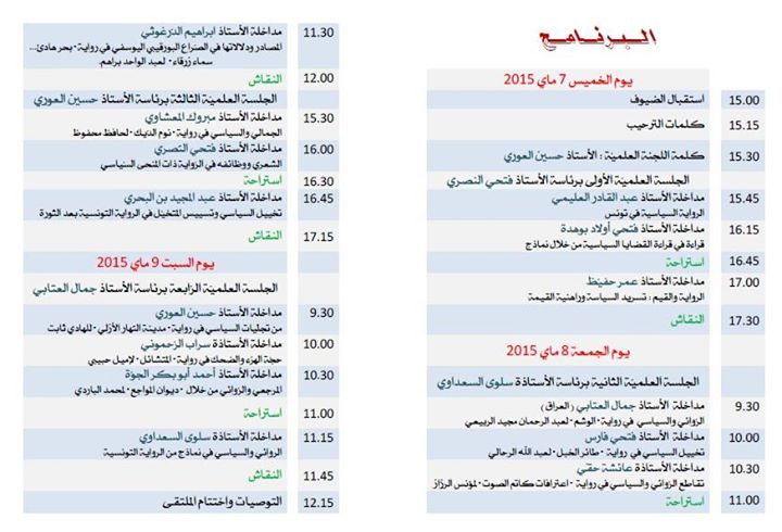 وستبحث هذه التظاهرة التى تحتضنها المكتبة الجهوية ببن عروس ويشارك فيها عدد من الادباء والباحثين والجامعيين التونسيين والأجانب توضيح العلاقة بين الروائي والسياسي فى الوقت الحالي وهل هي قائمة على التعارض او التصادم.