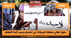 اعتصم اليوم الأحد 12 جويلية أهالي منطقة البريكات التابعة لعمادة هماد من معتمدية الشبيكة بمقرالجمعية المائية بسبب معاناتهم اليومية من العطش. وقد عمدوا إلى قطع الماء من الخزان والبئر العميقة على خلفية عدم مدهم بالماء الصالح للشراب منذ أكثر من ...