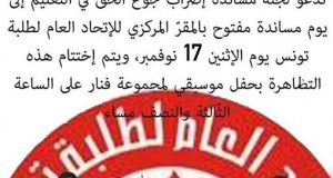 يدعو الاتحاد العام لطلبة تونس إلى “يوم إضراب جوع وطني مساندة” وذلك يوم الإثنين 17 نوفمبر 2014 من أجل دعم الطلبة المضربين عن الطعام منذ 4 نوفمبر الجاري بالمقر المركزي الكائن بباب الخضراء.